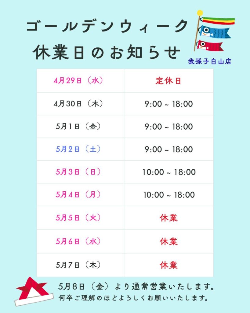 ゴールデンウィーク営業のお知らせ